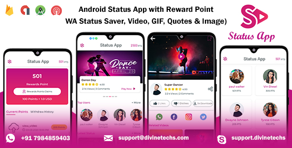 Download Best Seller “Android Status App With Reward Point (WA Status Saver + Video/Image/GIF/Quotes + Earn points)” from Codecanyon for category “full-applications”. Related Tags: android Video/Image/GIF/Quotes status app, download Video/Image/GIF/Quotes, earn reward points, facebook Video/Image/GIF/Quotes status, instagram Video/Image/GIF/Quotes status, push notification, reference point, reward video ads, share Video/Image/GIF/Quotes status, twitter status, User Earning app, WA status saver, whatsapp status, WhatsApp video status
